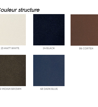 | Couleur | black – grey black, corten – rust, coten – coral, dark blue – navy blue, indian brown – hazel, mat white – white grey |