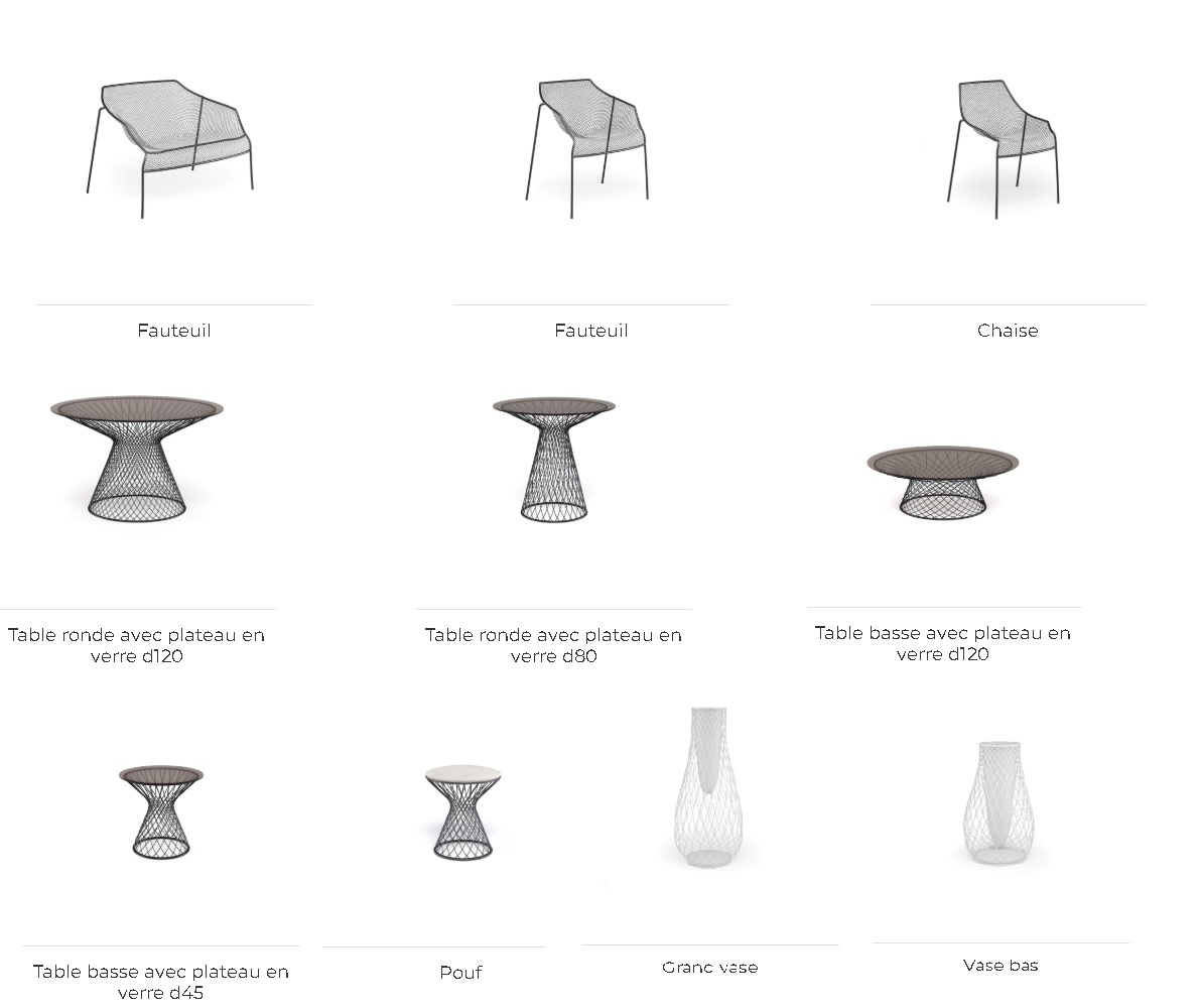 L’acier des sièges s’associe à la transparence du verre pour les tables assorties, apportant une sensation de fluidité et de légèreté presque immatérielle. Pensée pour les environnements extérieurs, cette chauffeuse s’intègre parfaitement aux terrasses, jardins ou patios, tout en assurant confort et stabilité.