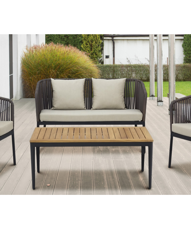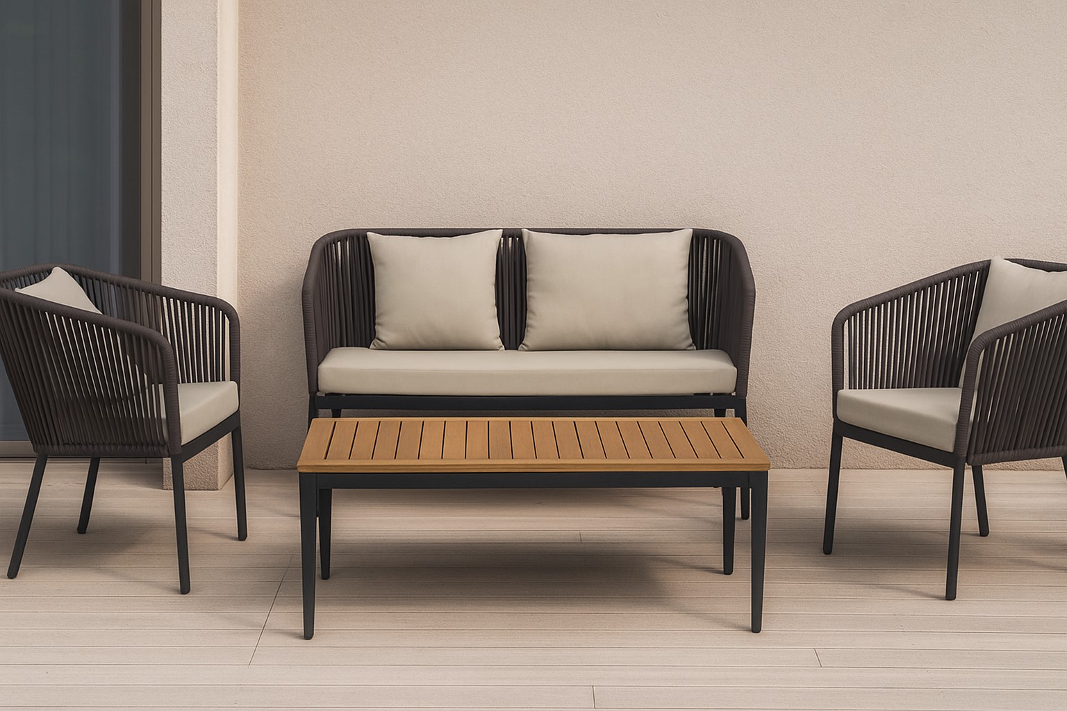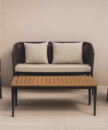 Un salon élégant et résistant, conçu pour l’extérieur. Sa structure en aluminium peint et son tressage en polyéthylène assurent légèreté, durabilité et confort. Les coussins hydrofuges apportent une touche de confort supplémentaire, tandis que la table basse, avec son plateau en teck, complète harmonieusement l’ensemble.