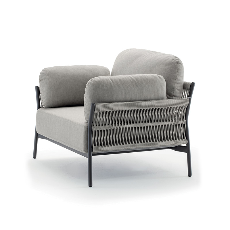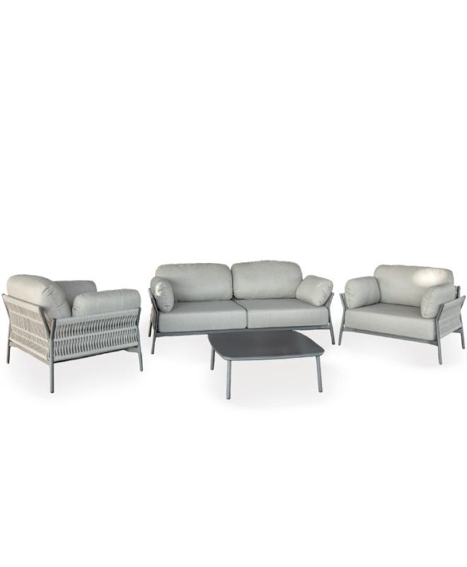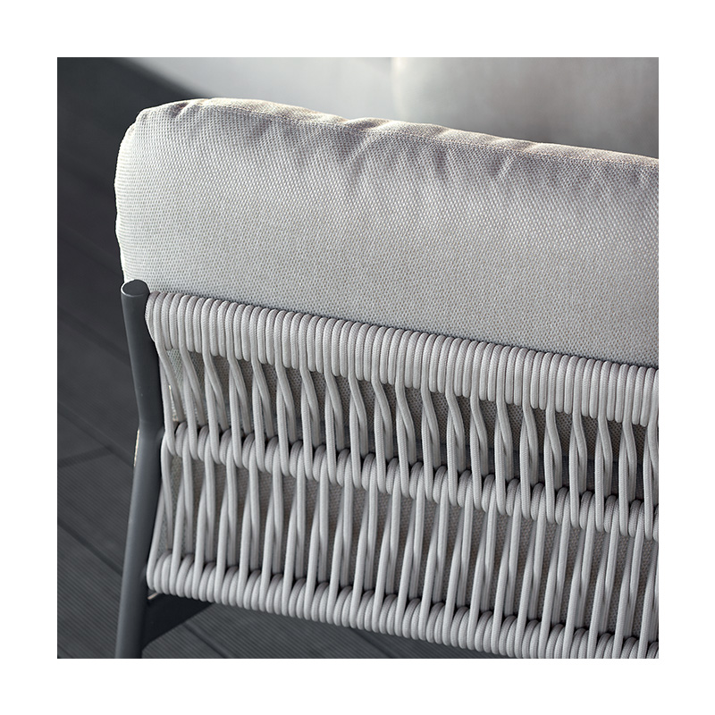 Sa structure associe des lignes épurées à un tressage en corde, apportant une touche chaleureuse et contemporaine. Les assises, confortables et accueillantes, sont équipées de coussins déhoussables conçus pour un usage extérieur, offrant une excellente tenue dans le temps et un confort optimal au quotidien.