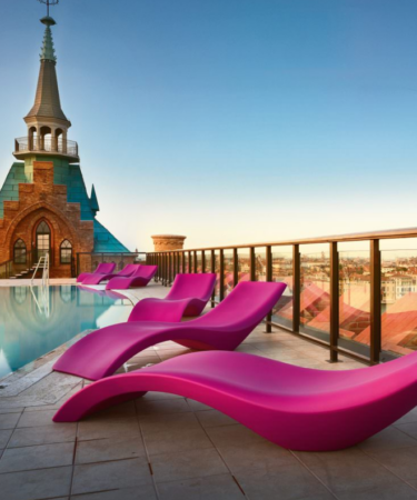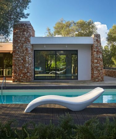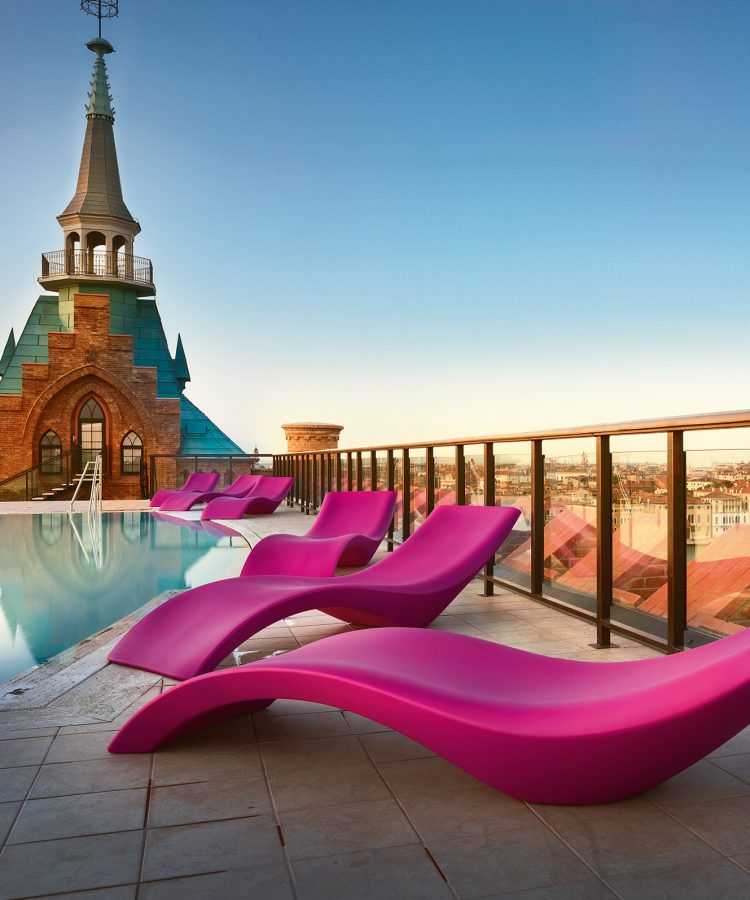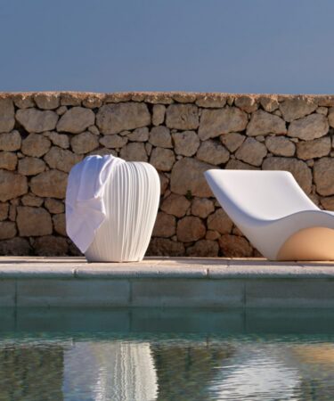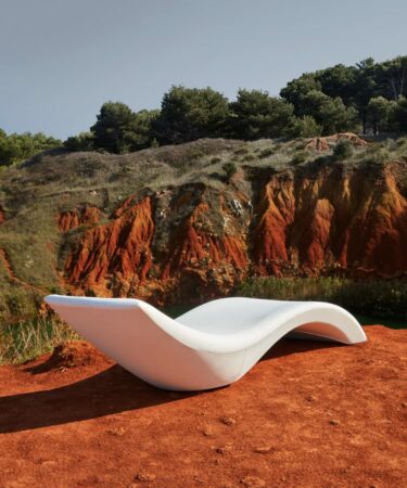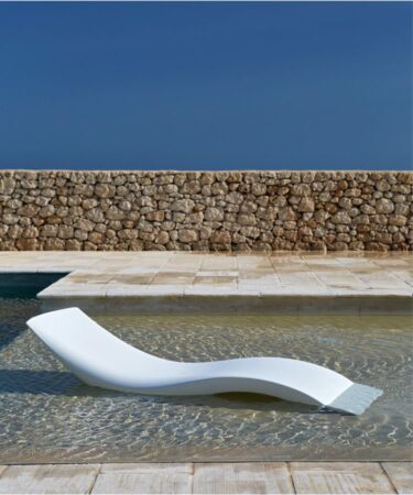 Sculptural, élégant, polyvalent, ce transat convient à tout espace extérieur, peut être partiellement immergé dans l’eau
