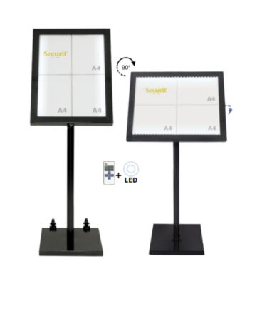 Porte-menu noir, acier galvanisé, utilisation intérieure ou extérieure, avec système de fermeture (serrure/clef) et LED de couleur blanche. Est fourni avec une télécommande, pied et socle ainsi qu’un adaptateur avec un câble de 5 mètres (non étanche). Compatible avec les batteries Securit® (non incluses).